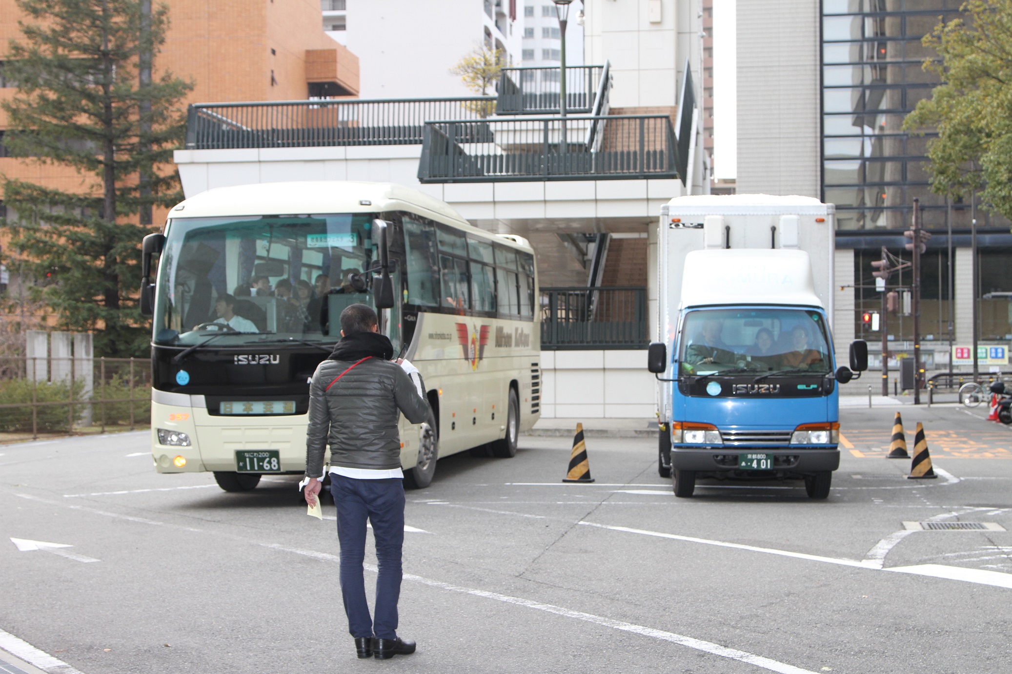 9時のホール開館まで時間があるので、奏者はバスの中に待機してもらいます。