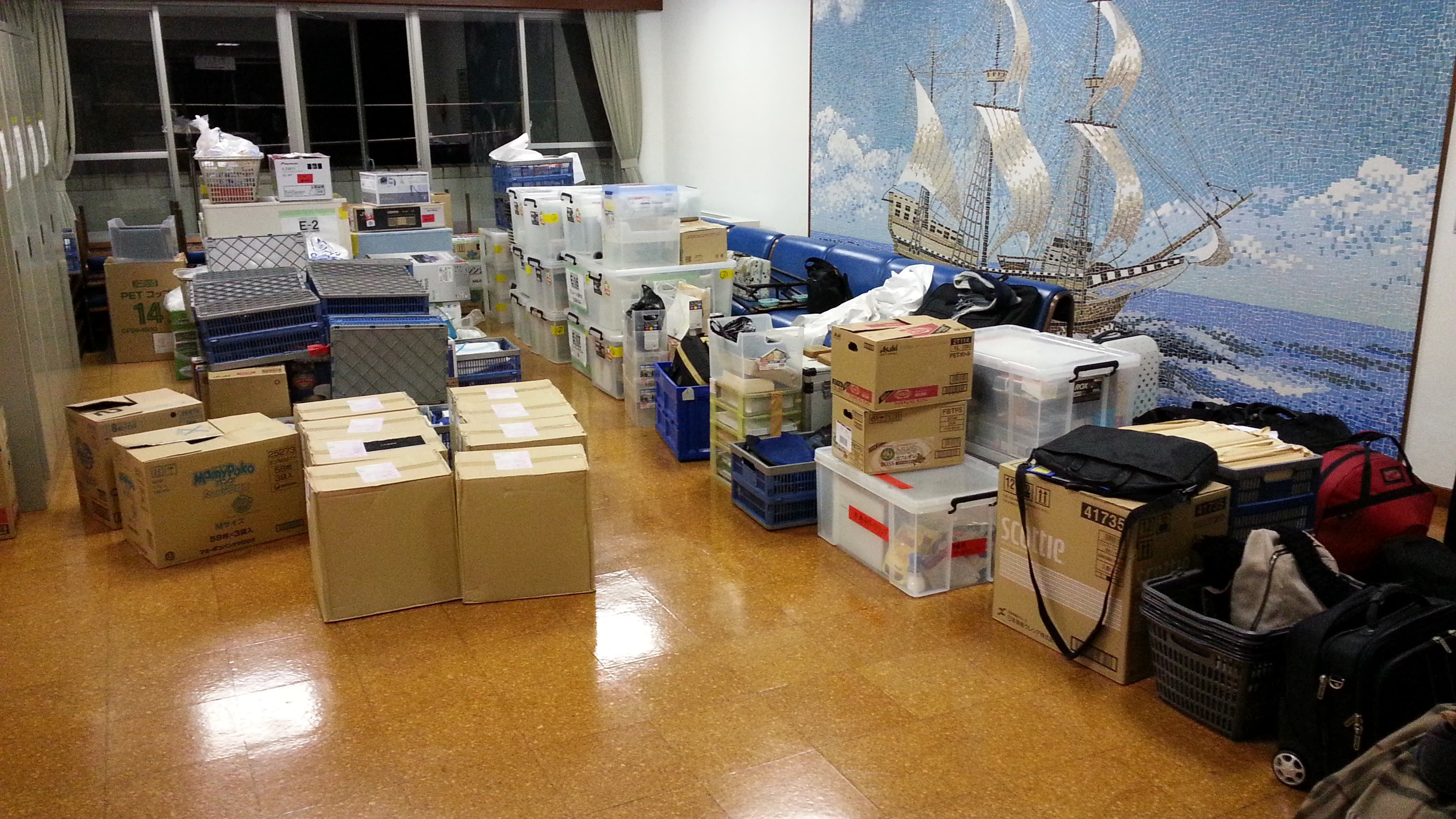 バン2台にパンパンに詰まった荷物の積み下ろし・本部前に荷物の大移動。