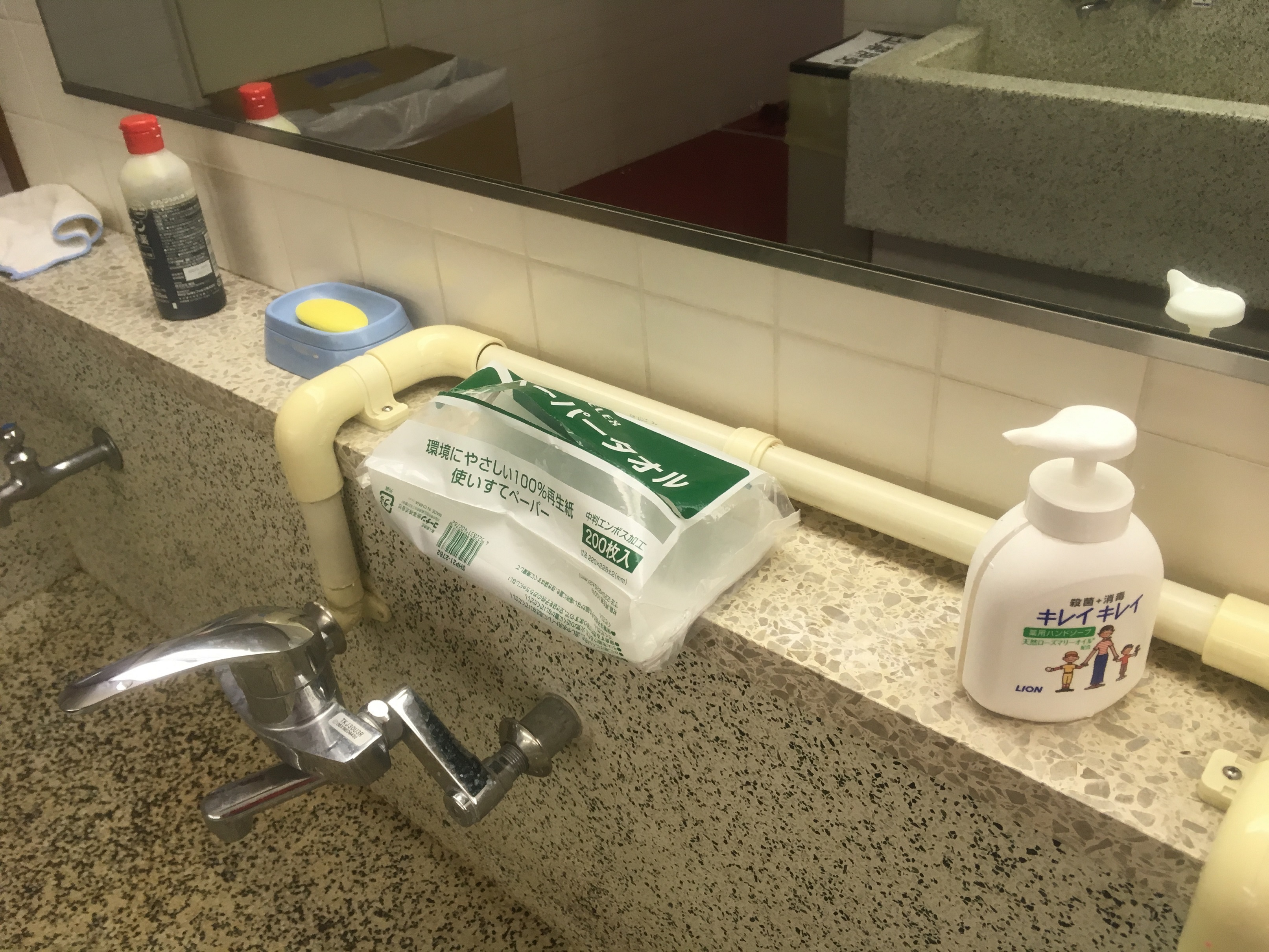 各手洗い場所の設営:ペーパータオルと薬用せっけん、うがい薬の3点セット